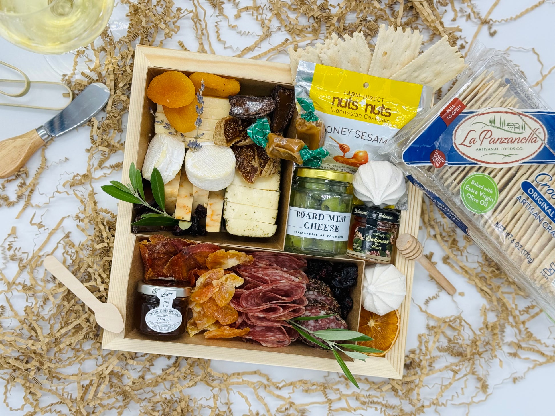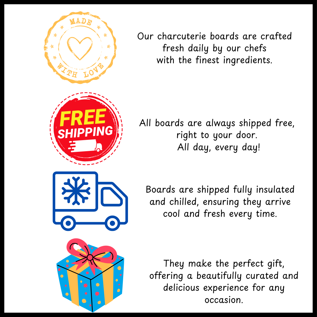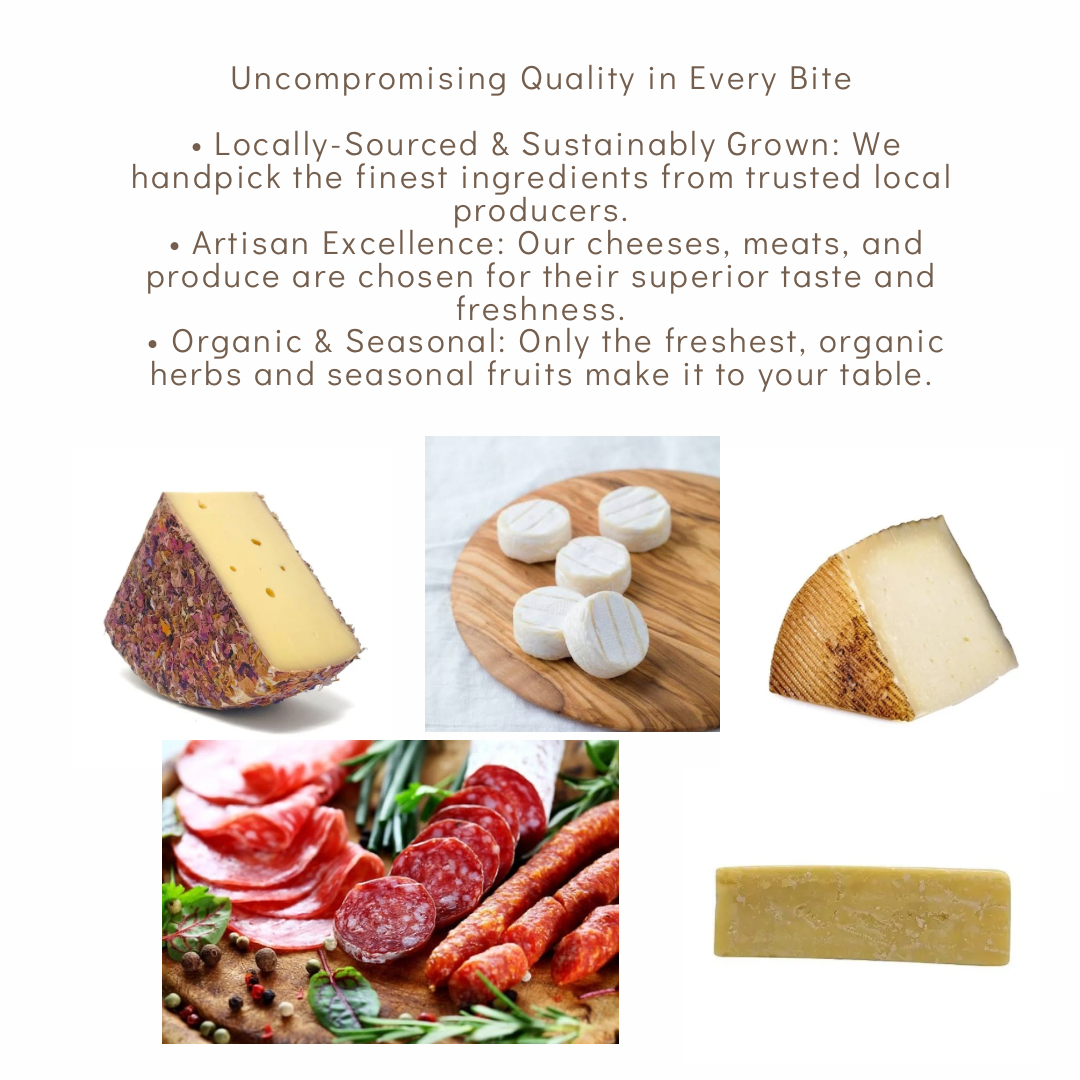 Featuring a delectable assortment of Artisan Cheeses, Cured Meat, Savory Olives, Local Organic Honey, Gourmet Nuts, Fresh Seasonal Fruits and Veggies, Flowers and Fresh Herbs, Dried and Candied Fruits, and Seasonal Accompaniments. Each board is a symphony of flavors and textures. Elevate your dining experience with our meticulously curated selection, perfect for any occasion.